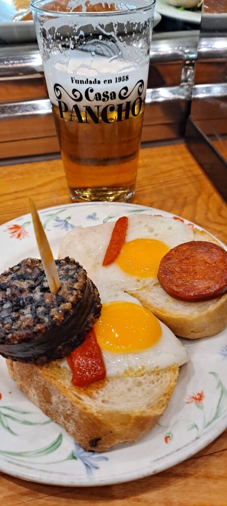 Antes de llegar a la ciudad, ya David nuestro conductor del blablacar ya nos había marcado los restaurantes para comer, el lechazo en el «Asador de Azofra», aunque no es un sitio barato. Los bares para las tapas: cualquiera de Calle San Lorenzo, La Plaza la Flora o la Calle la paloma. Entre los más famosos: El Pancho, La Favorita, La Mejillonera. No debíamos dejar de probar Cojonuda y Cojonudo (morcilla de Burgos y la otra Chorizo, con pimiento del piquillo o huevo), el tigre que es un mejillón relleno. Otro sitio de parada obligatoria es el Morito pero tener en cuenta que sólo aceptan efectivo. » La Cantina, vinos y viandas» para comer Zamburiñas y navajas en la Calle del Arco del Pilar con Calle de Fernan González.
