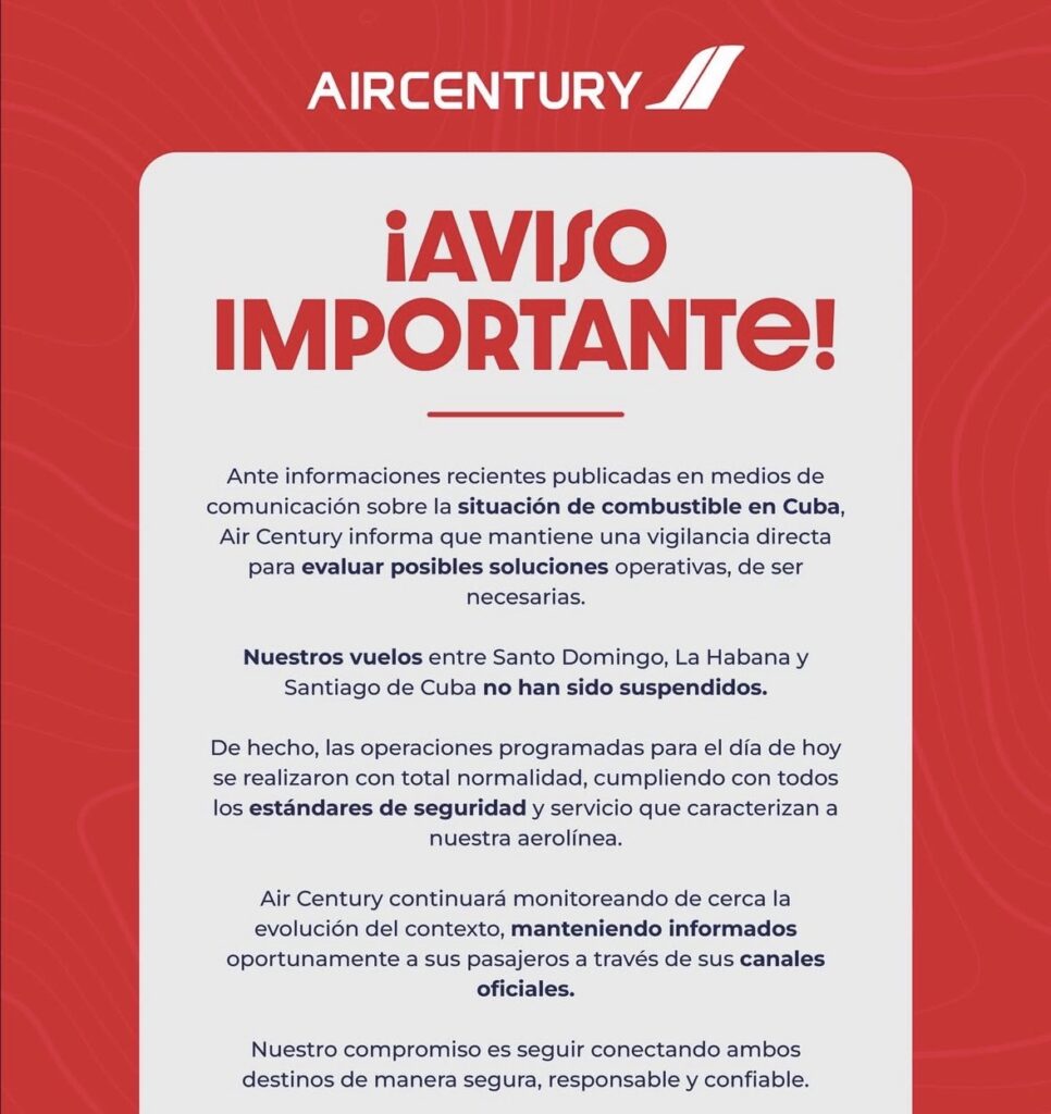- La Compañia Aircentury anunció que mantendrá sus vuelos a Cuba.